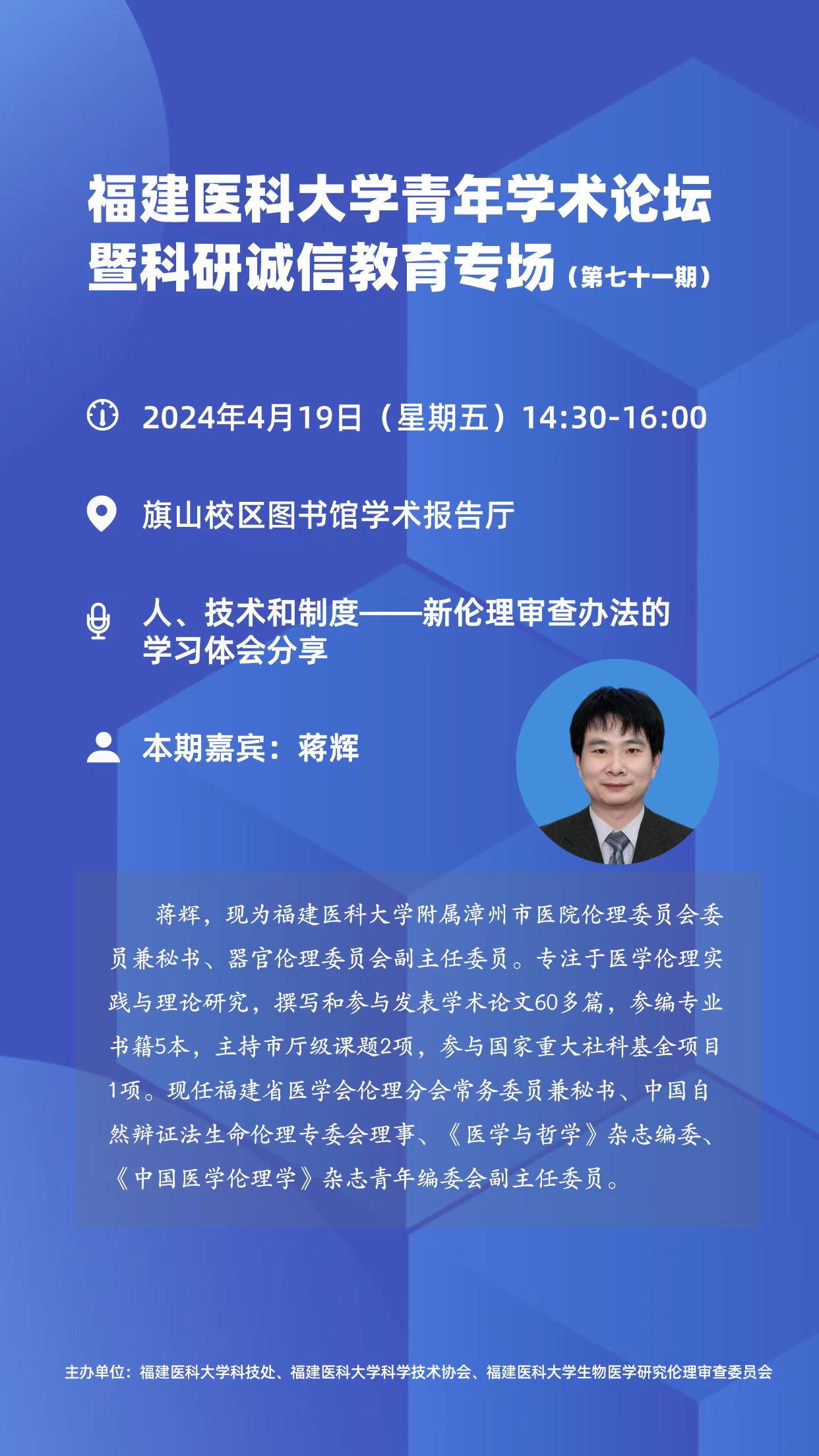蔣輝,現(xiàn)為南宮28附屬漳州市醫(yī)院倫理委員會委員兼秘書、器官倫理委員會副主任委員。專注于醫(yī)學(xué)倫理實(shí)踐與理論研究,撰寫和參與發(fā)表學(xué)術(shù)論文60多篇,參編專業(yè)書籍5本,主持市廳級課題2項(xiàng),參與國家重大社科基金項(xiàng)目1項(xiàng)。現(xiàn)任福建省醫(yī)學(xué)會倫理分會常務(wù)委員兼秘書、中國自然辯證法生命倫理專委會理事、《醫(yī)學(xué)與哲學(xué)》雜志編委、《中國醫(yī)學(xué)倫理學(xué)》雜志青年編委會副主任委員。南宮28青年學(xué)術(shù)論壇第七十一期暨科研誠信教育專場海報(bào).jpg