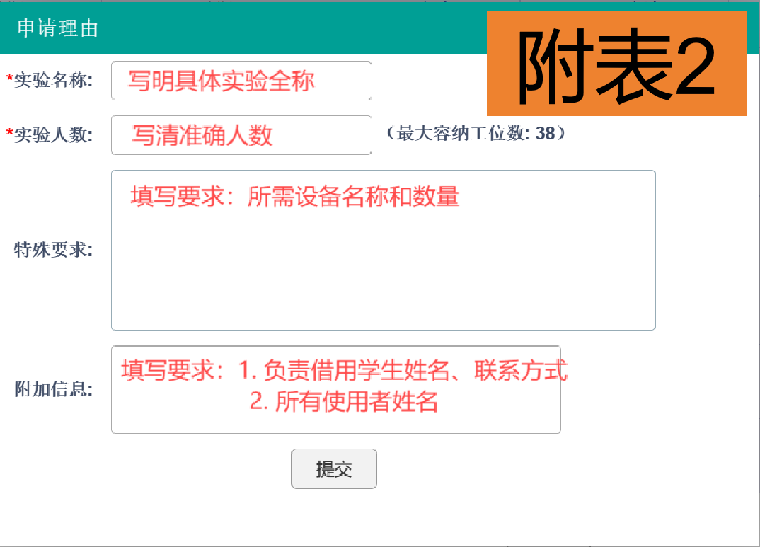 2. 請準確寫明預(yù)約開放【實驗名稱】(如:XX實驗/XX訓(xùn)練),并在【特殊要求】欄中填寫所需設(shè)備名稱和數(shù)量,在【附加信息】中填寫借用者姓名、聯(lián)系方式(具體填表要求見附表2)。